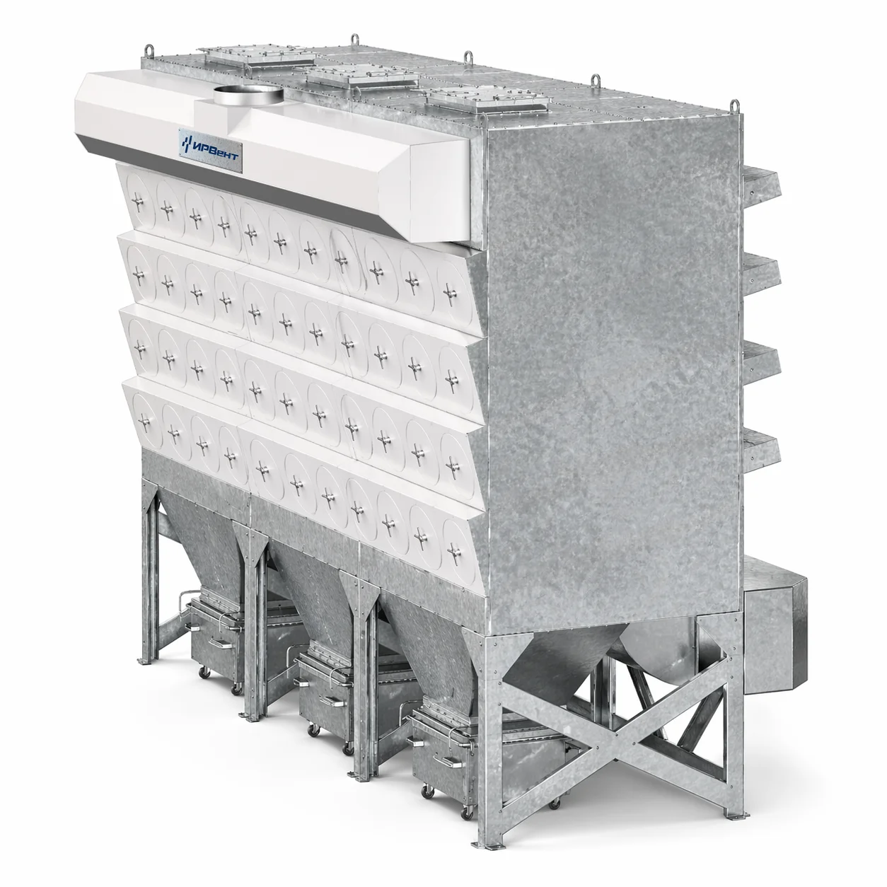 Вытяжная фильтр-вентиляционная установка (ФВУ) IRVENT-48 представляет собой отдельный корпус с фильтрующими картриджами и радиальный вентилятор в шумозащитном коробе. Очищенный воздух выводится в атмосферу. Очистка фильтров сжатым воздухом производится автоматически, при активации электромагнитных клапанов по сигналу с шкафа управления ФВУ IRVENT-48. Пыль, выдуваемая из фильтров сжатым воздухом, попадает в выдвижную тележку, установленную под бункером.
