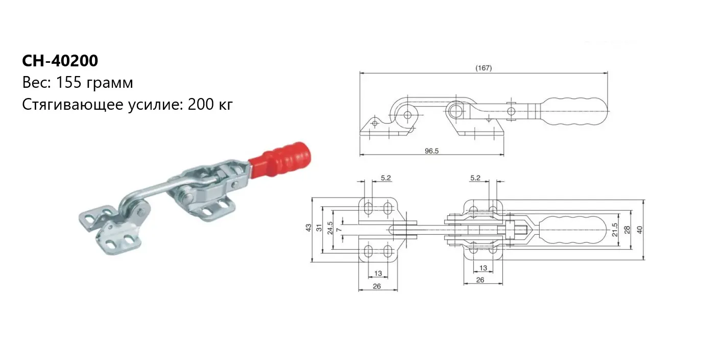 может работать либо в одной плоскости, либо под прямым углом. Зажимы стягивающего типа применяются для плотной стыковки двух изделий. Процесс фиксации происходит за счет зацепления крюка зажима за ответную часть. Такой механизм зажима ещё называют натяжной замок или зажим замок.